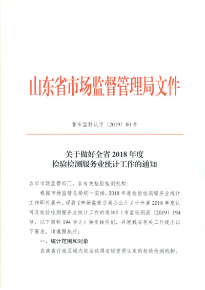 關(guān)于做好全省2018年度檢驗(yàn)檢測(cè)服務(wù)業(yè)統(tǒng)計(jì)工作的通知(魯市監(jiān)科認(rèn)字[2019]80號(hào))
